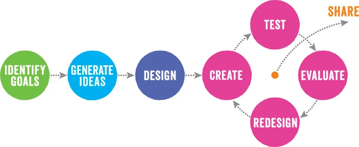 Then, the third category that I would love for school to pursue is to teach him process. This is the part that, again, coupled with mindset can be applied to any future state. What we're talking about is educating kids for a lifetime, not just for some sort of job that they're going to do in five years. We have the mindset, but we also need the process skills - the basic idea of how do you go from idea to finished thing. 1) The ability to identify a goal or a vision and 2) the ability to generate ideas to meet that goal - the"How might we achieve this?" kinds of questions. 3) Creating a basic design and then 4) a prototype of whatever it is you're thinking about doing. Then going into that iterative loop of creating, testing, evaluating, and revising multiple times - and not giving up in the middle, so that at the end of the day you get to share whatever it is that you've created.
